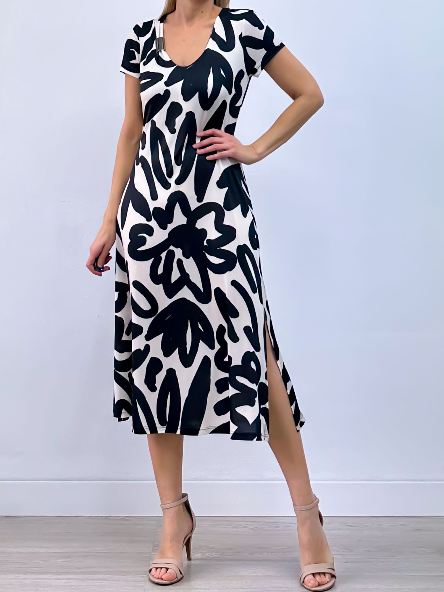 Vestido VICTORIA MORENO de punto seda estampado manga corta con escote asimétrico y abalorio en metal detalle de abertura en forma de lágrima en espalda
