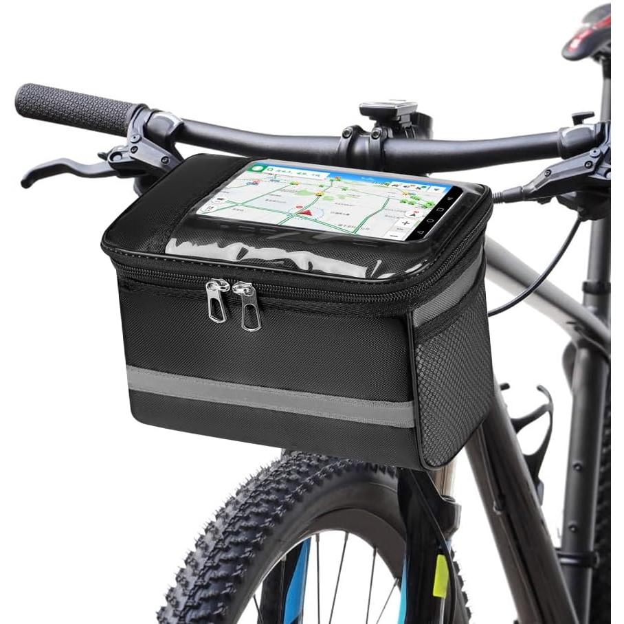 Waterproof large capacity bicycle handlebar bag with touch screen phone holder and rear top tube bag.