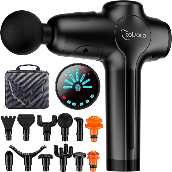 Pistola de masaje muscular Cotsoco,Massage Gun de percusión de tejido profundo para atletas, Masajeador deportivo eléctrico portátil súper silencioso con 12 cabezales de masaje(Negro)