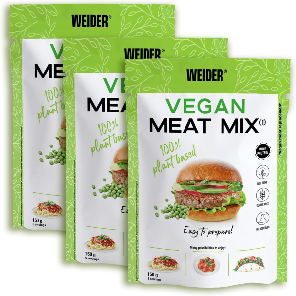 Weider Pack Vegan Meat Mix – 3 Unidades. Sustitutivo de carne rico en Proteina Vegetal 75% + Fibra Vegetal 20%. Sin Gluten. Sin Conservantes. Fácil Preparación. Recetas Infinitas. 3x150g
