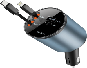 Carehabi Cargador de Coche de Carga Rápida 4 en 1 60W, Cable de Carga Lightning, Type-C Retráctil de 80CM, Adaptador de Mechero de Coche con USB-A USB-C para iPad iPhone Samsung Andriod